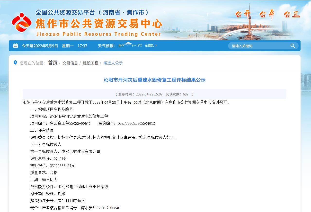 2022年4月29日,焦作市公共資源交易中心傳來喜訊,我司參與的沁陽市丹河災(zāi)后重建水毀工程被確定為第一中標候選人,中標金額23109688.24元,這是我司水毀類工程的新突破,也是我公司良好信譽與綜合實力的再次體現(xiàn)。
